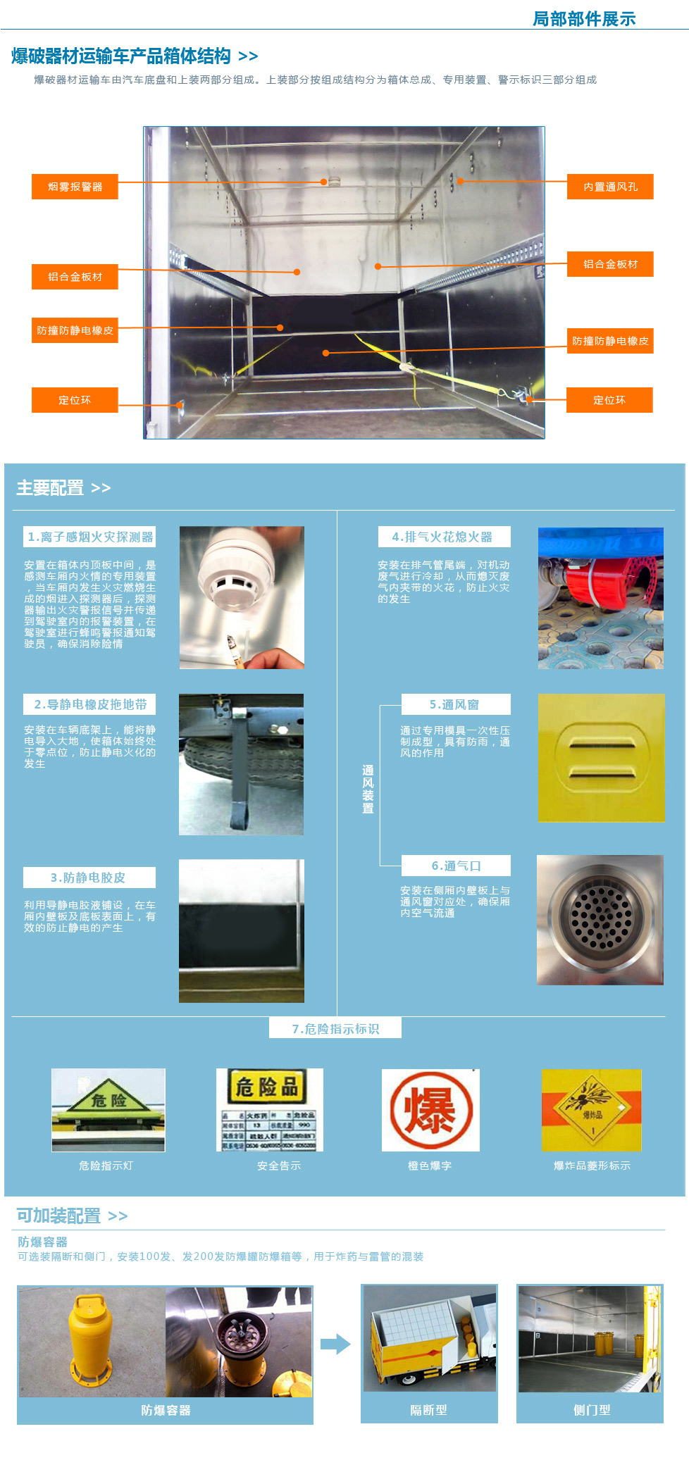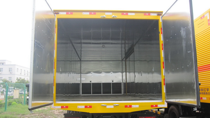 廂體頂部封閉,不可開(kāi)啟, 該車隨底盤選裝駕駛室,選裝右側(cè)面單門安裝位置靠近廂體前部;防護(hù)材料:Q235A碳鋼,連接方式:左右側(cè)面防護(hù)均采用焊接連接,后下部防護(hù)與車架采用焊接連接,后部防護(hù)斷面尺寸(mm):120?0,后部防護(hù)離地高度(mm):450。運(yùn)輸品名:炸藥,雷管,煙花爆竹等,類項(xiàng)號(hào):1.1B,1.1D,1.1G,1.2G,1.3G,1.4G 等。選用ISD180 50,YC6JA180-50型號(hào)發(fā)動(dòng)機(jī),對(duì)應(yīng)油耗值(L/100km)分別為:26.8,27.1,整車長(zhǎng)度與軸距對(duì)應(yīng)關(guān)系(mm):8990/5100,8590/4700。該車安裝具有衛(wèi)星定位功能的行駛記錄儀,僅采用底盤子午線輪胎和帶ABS的底盤; 該車前置排氣管,安裝限速裝置,限速80km/h, ABS型號(hào)為ABS-E 4S/4M,生產(chǎn)企業(yè)是威伯科汽車控制系統(tǒng)(中國(guó))有限公司。